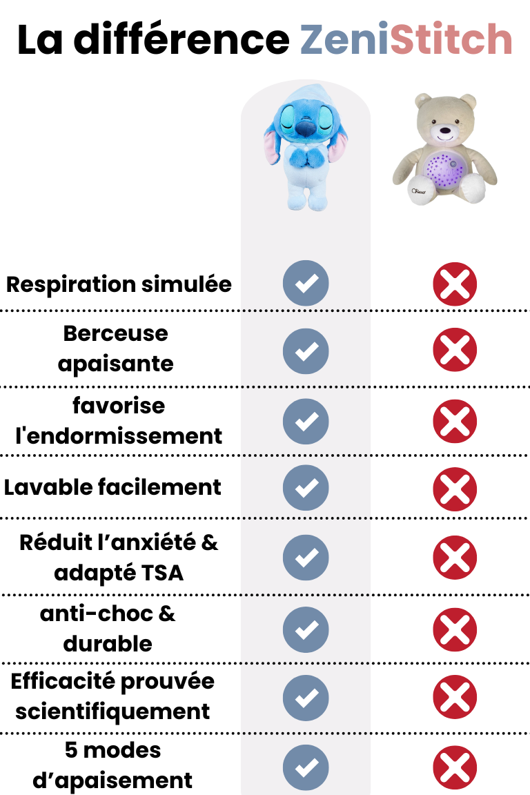 ZeniStitch simule un mouvement respiratoire doux et régulier, imitant la respiration humaine pour apaiser l’enfant naturellement et favoriser l’endormissement.